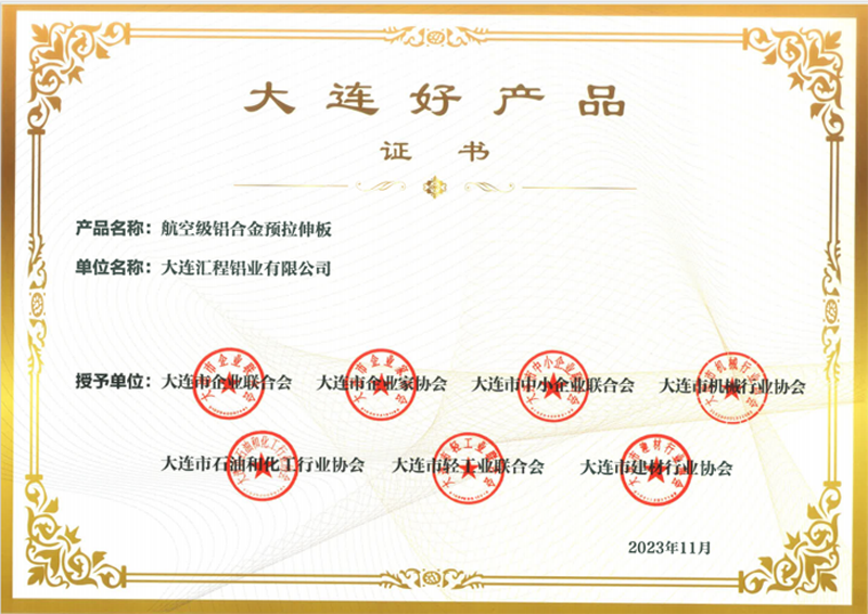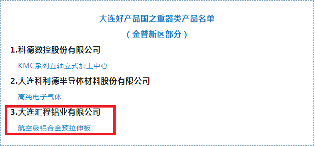 在首批“大连好产品”名单中,金普新区共3家企业3个产品入选国之重器类“大连好产品”。其中,德泰控股所属公司汇程铝业以“航空级铝合金预拉伸板产品”成功入选。